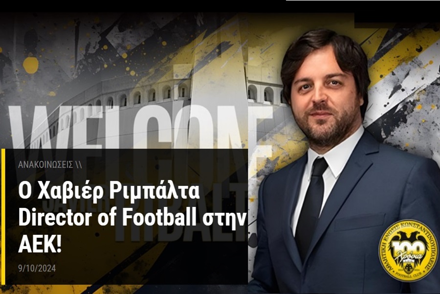 Σήμερα, ανακοινώθηκε, επίσημα, η συνεργασία με τον Χαβιέρ Ριμπάλτα, ο οποίος αναλαμβάνει Διευθυντής ποδοσφαίρου της ΑΕΚ-ΠΑΕ και θα «τρέχει» όλο το ποδοσφαιρικό τμήμα.