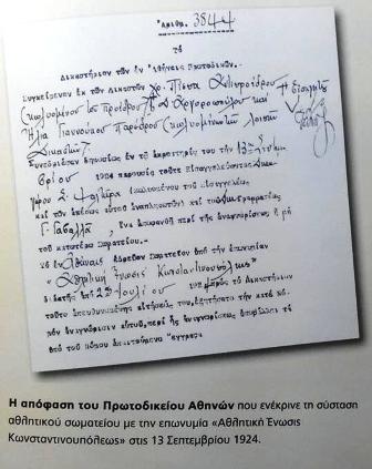 «Κάτι πρέπει να γίνει» ήταν η φράση που ακουγόταν όλο και πιο συχνά στο μικρό μαγαζάκι αθλητικών ειδών Λουξ του Αιμίλιου Ιωνά και του Κωνσταντίνου Δημόπουλου στην οδό Βερανζέρου. Έτσι, στις 13 Απριλίου του 1924 και ύστερα από πoλύωρη συζήτηση, η παρέα πήρε την τελική απόφαση για την ίδρυση ενός συλλόγου με την επωνυμία Αθλητική Ένωση Κωνσταντινουπόλεως. Ως έμβλημα επελέγη ασφαλώς ο Δικέφαλος Αετός και χρώματα το χρυσό και το μαύρο, όλα εμπνευσμένα από τη Βυζαντινή Αυτοκρατορία, για να θυμίζουν στους μεταγενέστερους την ένδοξη αθλητική παρακαταθήκη των Ελλήνων της Πόλης.