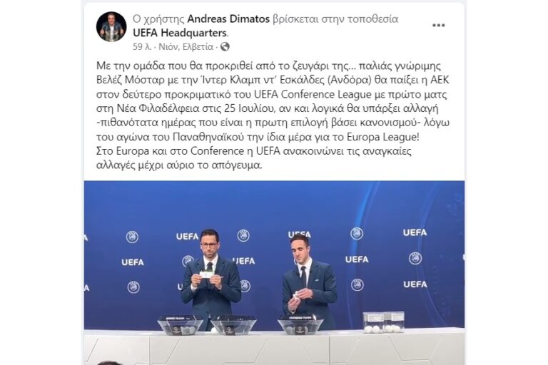 Με την ομάδα που θα προκριθεί, από το ζευγάρι της… παλιάς γνώριμης Βελέζ Μόσταρ, με την Ίντερ Κλαμπ ντ’ Εσκάλδες (Ανδόρα), θα παίξει η ΑΕΚ, στον δεύτερο προκριματικό του UEFA Conference League.To πρώτο ματς είναι για τις 25 Ιουλίου, στη Νέα Φιλαδέλφεια, αν και, λογικά, θα υπάρξει αλλαγή, πιθανότατα ημέρας, λόγω και του αγώνα του Παναθηναϊκού, την ίδια μέρα, για το Europa League!