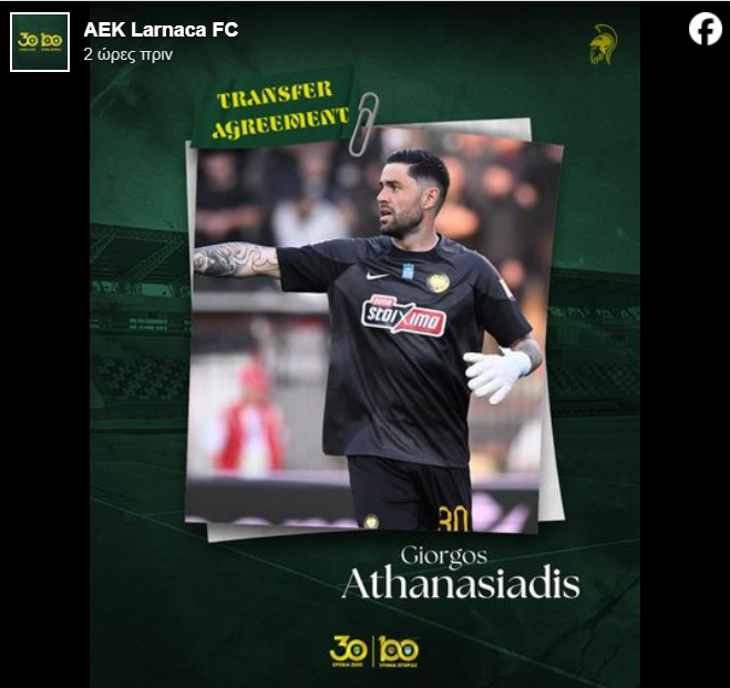 Η Αθλητική Ένωση Κίτιον (ΑΕΚ) Λάρνακας ανακοινώνει την καταρχήν συμφωνία με τον Έλληνα διεθνή τερματοφύλακα Γιώργο Αθανασιάδη.