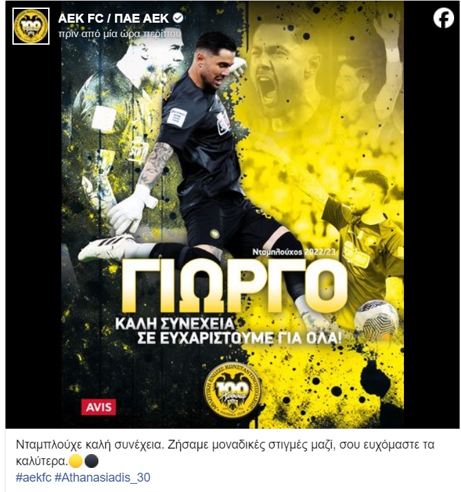 «Τον ευχαριστούμε, για την προσφορά του και βέβαια η οικογένεια της ΑΕΚ δεν θα ξεχάσει ποτέ, ότι ο Γιώργος ήταν από τους πυλώνες της πορείας μας, για το ιστορικό νταμπλ του 2023. Του ευχόμαστε υγεία και ό,τι καλύτερο, στη συνέχεια της καριέρας του».