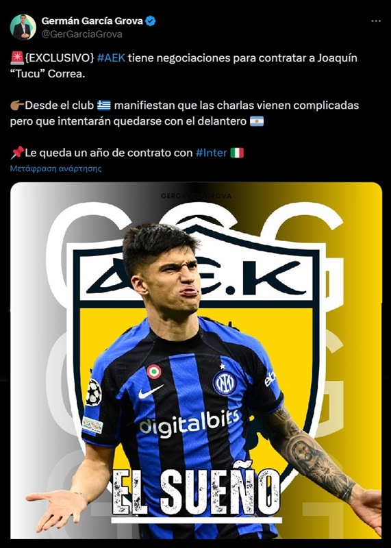 Όπως τονίζει, η περίπτωσή του είναι περίπλοκη, αλλά η ΑΕΚ φαίνεται να παλεύει την ολοκλήρωση μιας ακόμα σημαντικής μεταγραφής, αν και ο ποδοσφαιριστής έχει συμβόλαιο, με την Ίντερ, μέχρι το καλοκαίρι 2025.