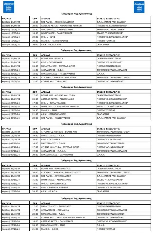 4η αγωνιστική : Κυριακή 15/9 ΠΑΟΚ – Παναθηναϊκός (20:30)