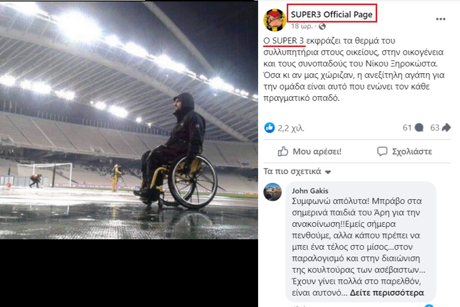 “Ο SUPER 3 εκφράζει τα θερμά του συλλυπητήρια στους οικείους, στην οικογένεια και τους συνοπαδούς του Νίκου Ξηροκώστα. Όσα κι αν μας χώριζαν, η ανεξίτηλη αγάπη για την ομάδα είναι αυτό που ενώνει τον κάθε πραγματικό οπαδό.”