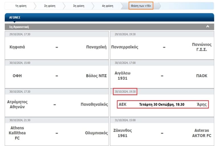 Η ΕΠΟ γνωστοποίησε το πρόγραμμα της 1ης αγωνιστικής της φάσης των «16» του Κυπέλλου Ελλάδας.