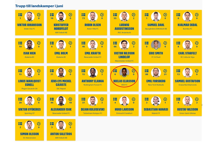 Ο Νίκλας Ελίασον κλήθηκε στην Εθνική Σουηδίας, για πρώτη φορά στην καριέρα του. Μετά την εξαιρετική σεζόν του, με την ΑΕΚ, είναι στην αποστολή, για δύο φιλικούς αγώνες προετοιμασίας της εθνικής Σουηδίας, με τη Δανία (5/6) και τη Σερβία (8/6).