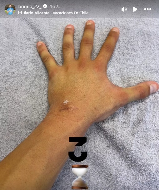 Ο Αλμπέρτο Μπρινιόλι “ανέβασε” φωτογραφία, στα social media, με το τραυματισμένο χέρι του, χωρίς νάρθηκα και μια κλεψύδρα που αδειάζει και φανερώνει, ότι δεν αργεί η στιγμή επιστροφής στη δράση, μετά τον σοβαρό τραυματισμό του, στο ζέσταμα του αγώνα με την Ίντερ Ντ’ Εσκάλδες, στις 24 Ιουλίου, όταν ο Ιταλός τερματοφύλακας υπέστη κάταγμα, στο σκαφοειδές της αριστερής πηχεοκαρπικής και η εκτίμηση ήταν, πως θα έμενε εκτός δράσης, για περίπου δυόμισι μήνες.
