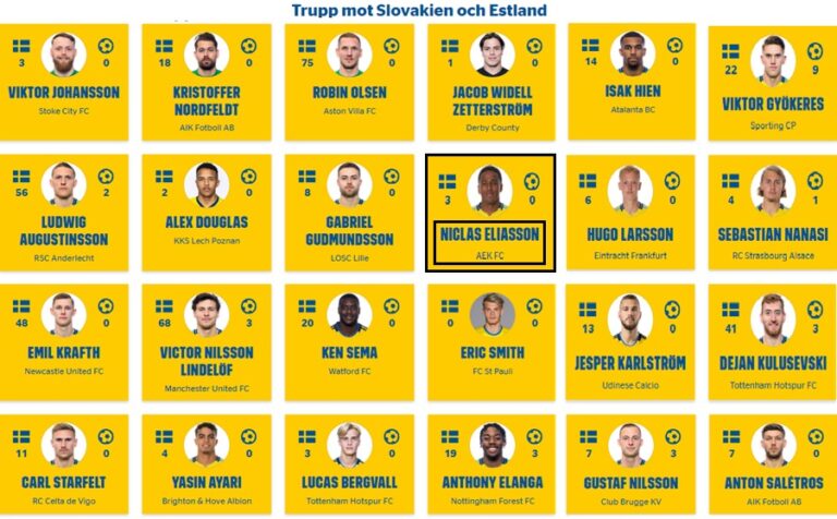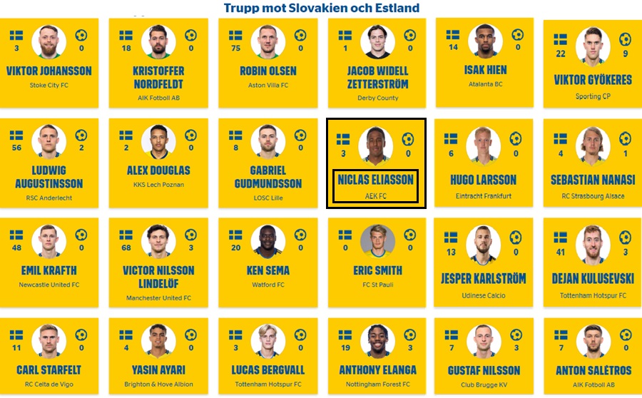 Ο Νίκλας Ελίασον είναι και πάλι στις κλήσεις της εθνικής ομάδας της Σουηδίας. Ο διεθνής εξτρέμ της ΑΕΚ, που έχει τρεις συμμετοχές, από το ντεμπούτο του, τον περασμένο Ιούνιο, κλήθηκε και πάλι, όπως αναμενόταν, από τον Τόμασον, για τα παιχνίδια του Nations League, τον Οκτώβριο, στα οποία η Σουηδία θα αντιμετωπίσει τη Σλοβακία, εκτός έδρας και την Εσθονία, στις 11 και 14 Οκτωβρίου, αντίστοιχα.