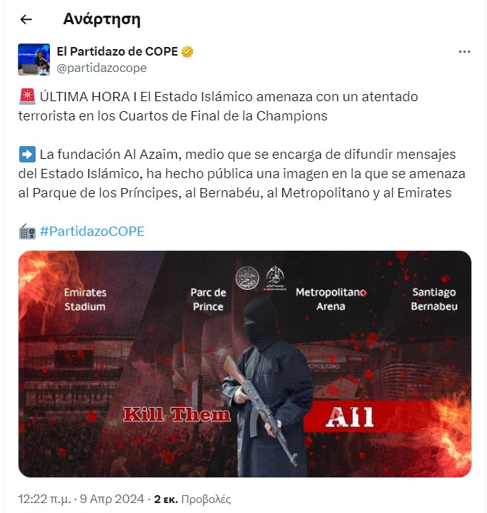 Όπως μετέφερε το ισπανικό «ondacero.es», το Ισλαμικό κράτος δημοσίευσε μια φωτογραφία, στην οποία απεικονίζονται τα τέσσερα γήπεδα, που θα φιλοξενήσουν τα ματς της πρώτης φάσης των προημιτελικών του Champions League, την Τρίτη (9/4) και την Τετάρτη (10/4), απειλώντας, ότι θα επιτεθεί σε αυτά, κατά τη διάρκεια των αγώνων!