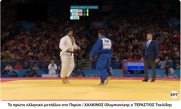 Ο Θόδωρος Τσελίδης άνοιξε το χορό των μεταλλίων, για την χώρα μας. Νίκησε, στον τελικό του ρεπεσάζ, τον Ισπανό Τριστάνι Μοασακλισβίλι 1-0, με wasa ari και κατέκτησε το χάλκινο μετάλλιο, στην κατηγορία των 90 κιλών, που είναι το τρίτο για τη χώρα μας στην ιστορία του τζούντο των Ολυμπιακών αγώνων και πρώτο στους Ολυμπιακούς αγώνες του Παρισιού για τα ελληνικά χρώματα.