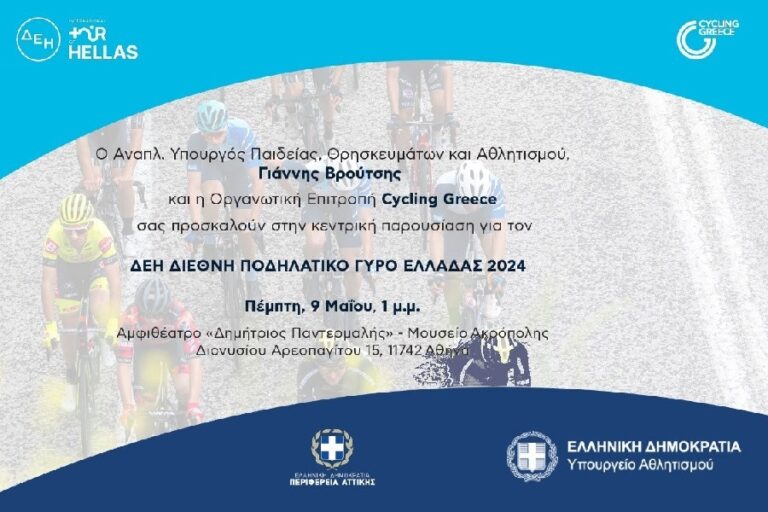 Ο ΔΕΗ Διεθνής Ποδηλατικός Γύρος Ελλάδας 2024 (14-19 Μαϊου) ανοίγει όλα τα χαρτιά του, αύριο Πέμπτη 9 Μαΐου 2024, στη 1 μ.μ.,στο αμφιθέατρο «Δημήτρης Παντερμαλής» στο Μουσείο της Ακρόπολης, με την κεντρική παρουσίασή του.