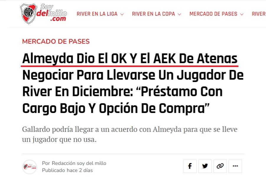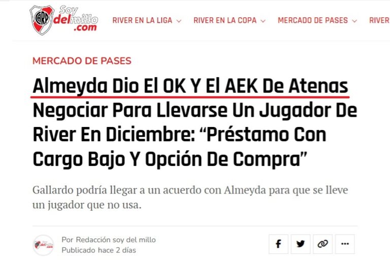 Όπως δημοσιεύει ο ιστότοπος της Αργεντινής, soydelmillo.com, μόλις λίγες εβδομάδες απομένουν για να ξεκινήσει το μεταγραφικό παζάρι, οι φήμες εξαπλώνονται ήδη στα social media. Διότι η ΑΕΚ Αθηνών ενδιαφέρεται για παίκτη της Ρίβερ. «Δάνειο με χαμηλή χρέωση και επιλογή αγοράς» δήλωσαν για το ενδιαφέρον που έδειξε τις τελευταίες ώρες ο Matías Almeyda .