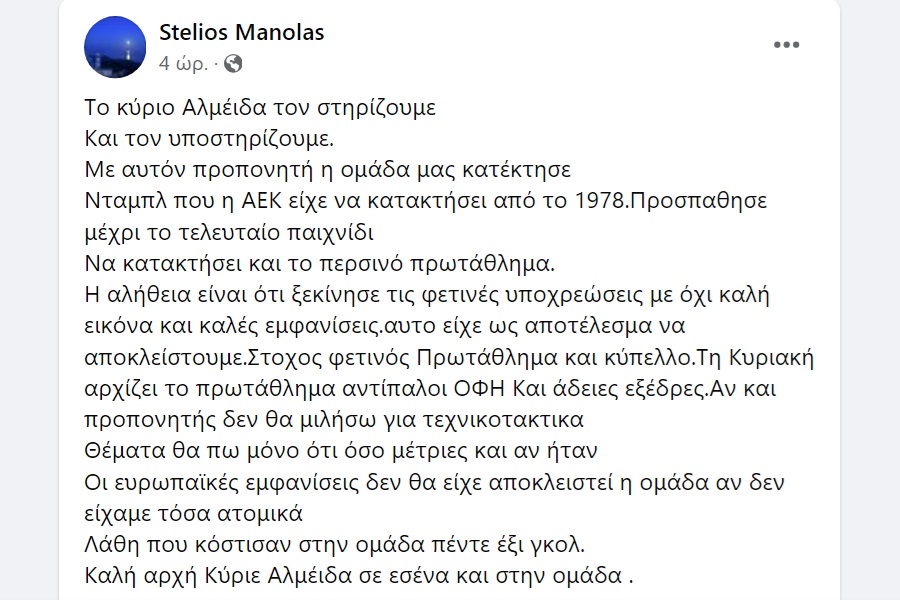 Στέλιος Μανωλάς: “Στηρίζουμε και υποστηρίζουμε Αλμέιδα”
