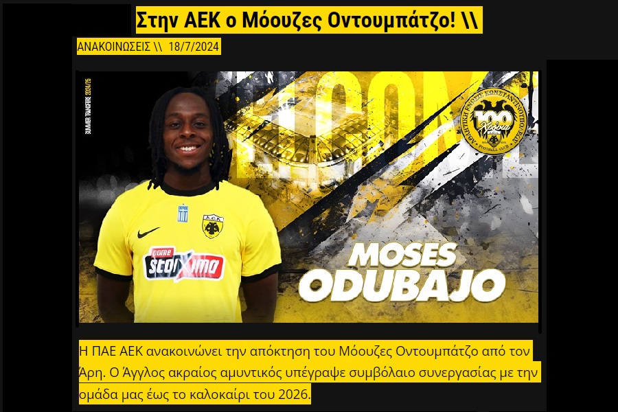 Η ΠΑΕ ΑΕΚ ανακοινώνει την απόκτηση του Μόουζες Οντουμπάτζο από τον Άρη. Ο Άγγλος ακραίος αμυντικός υπέγραψε συμβόλαιο συνεργασίας με την ομάδα μας έως το καλοκαίρι του 2026.