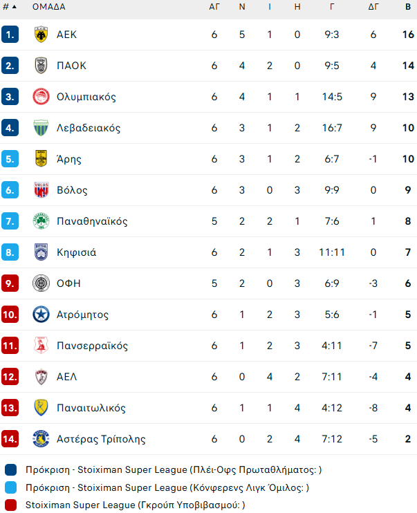 Συγκεκριμένα μετά τη νίκη της ΑΕΚ επί της Κηφισιάς με 2-3, αλλά και τη νίκη του ΠΑΟΚ στην Τούμπα με 2-1 κόντρα στον Ολυμπιακό, η «Ένωση» έμεινε μόνη πρώτη στη βαθμολογία με τον «Δικέφαλο του Βορρά» να περνάει την ομάδα του Φαλήρου και να την αφήνει τρίτη.