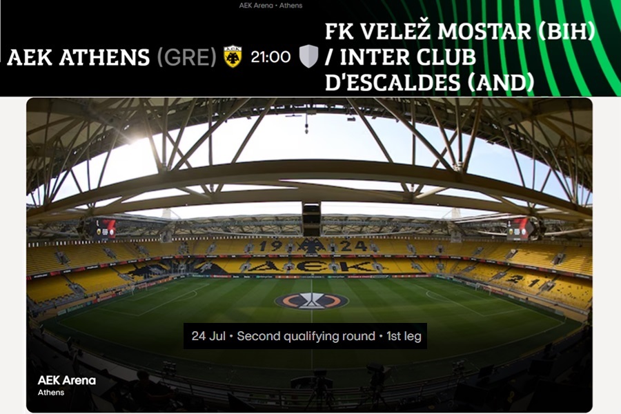 Την Τετάρτη 24 Ιουλίου, με ώρα έναρξης 21:00, η UEFA όρισε τον πρώτο φετινό ευρωπαϊκό αγώνα της ΑΕΚ, με αντίπαλο τον νικητή του ζευγαριού Βέλεζ Μόσταρ – Ίντερ ντ’ Εσκαλδές.